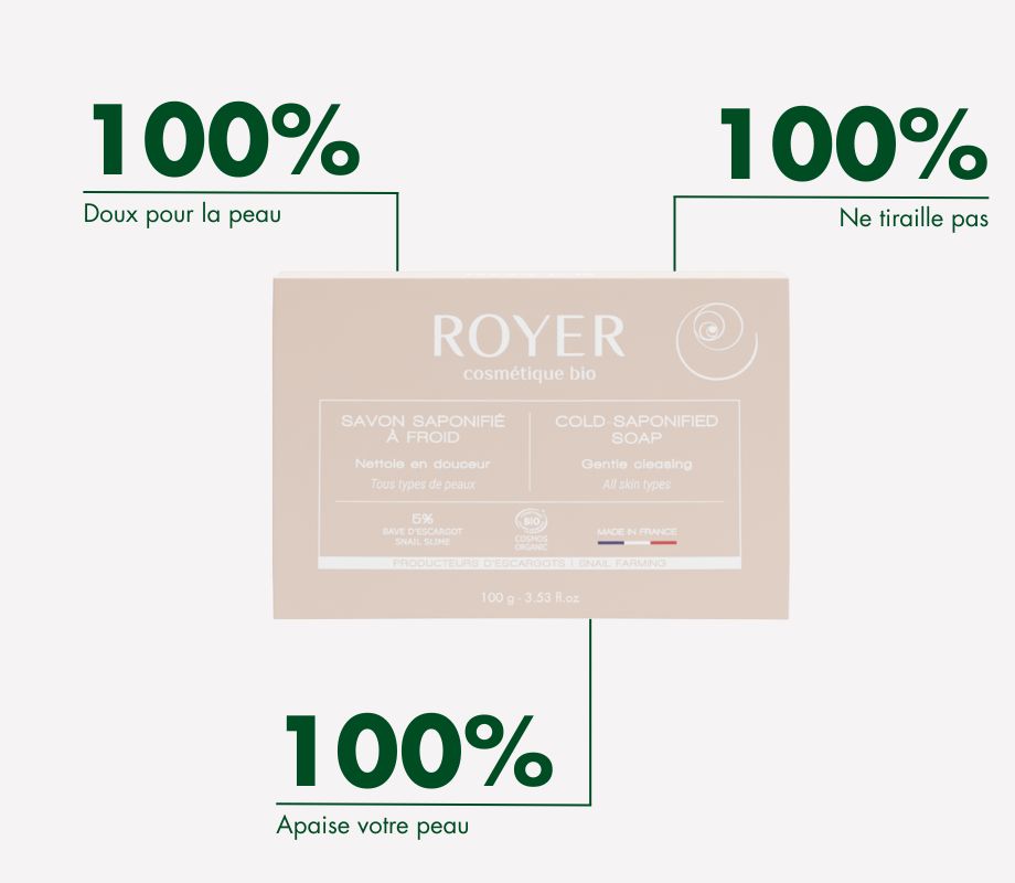 Chez Royer, nous récoltons une bave d’escargot pure, non diluée et naturellement riche en actifs essentiels. C’est ce qui nous distingue : contrairement aux extraits de bave utilisés dans la majorité des produits du marché, notre bave conserve 100 % de ses composants naturels. Cette pureté nous permet d’en intégrer de grandes quantités dans nos soins afin d’offrir à la peau une efficacité optimale